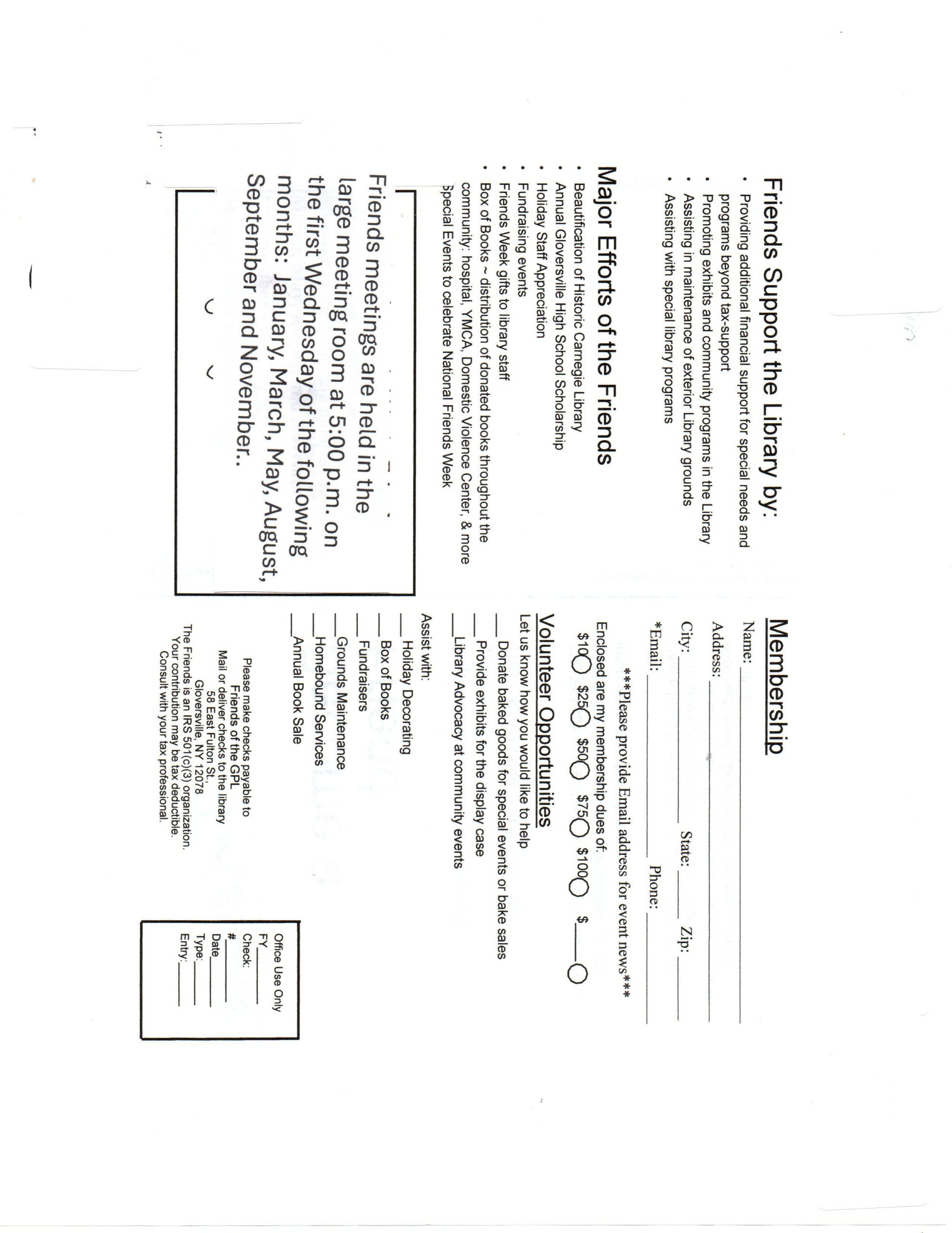 The Friends of the Gloversville Public Library was incorporated as a not-for-profit organization in 1974 to assist the library in its mission of serving this community. The Friends have more than 300 members who donate time, as well as money, to help improve the Gloversville Public Library. If you are able to donate time or money to the Friends, fill out our membership form today.